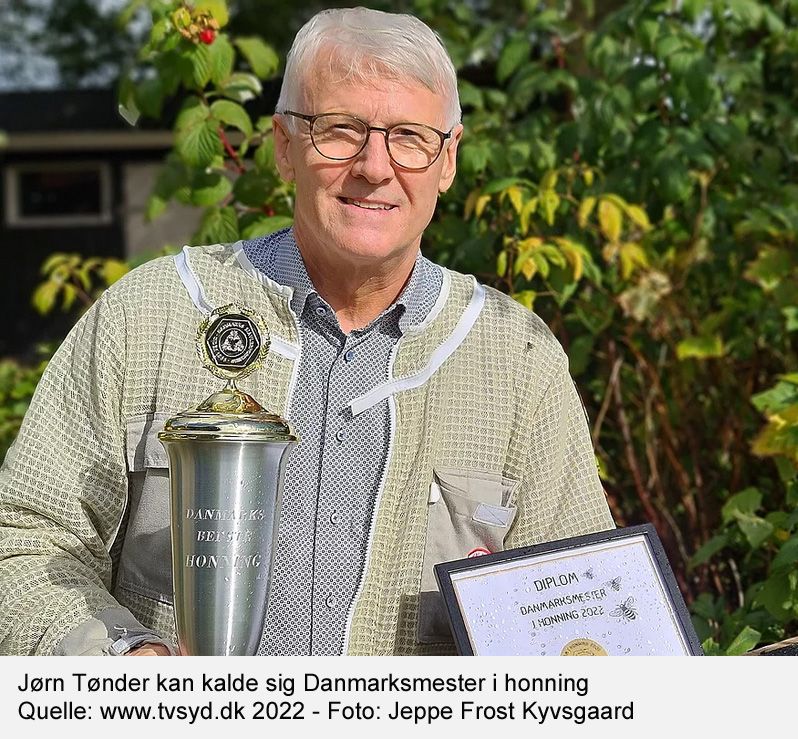 Jørn Tønder der, Imker Neuling im zweiten Jahr, hat mit artgerechtem, selbstverständlich behandlungsfreiem Imkern 2021 eine Silbermedaille und jetzt, 2022 den Goldpokal und die dänische Nationalmeisterschaft mit seinem artgerecht gewonnenen Honig errungen. Er bereitet sich für seine Teilnahme an den Weltmeisterschaften in Chile vor.