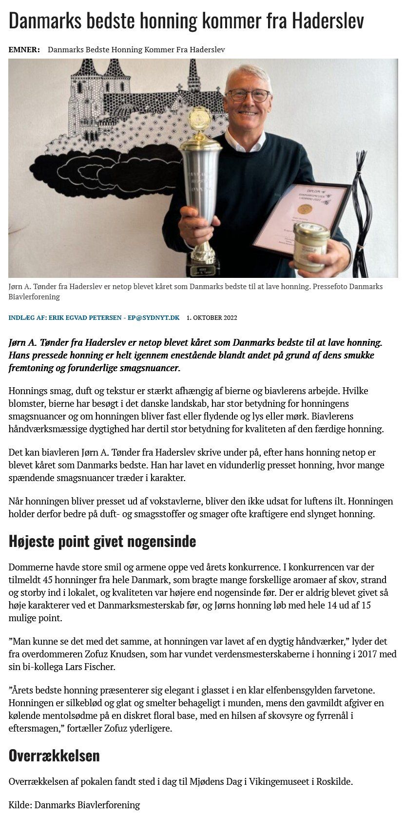 Věděl jsem, že jsem vytvořil labužnický med. Jako začátečník v prvním ročníku jsem hned vyhrál druhou cenu od Dánského svazu včelařů v Dánské ochutnávce medu z více než 400 účastníků.