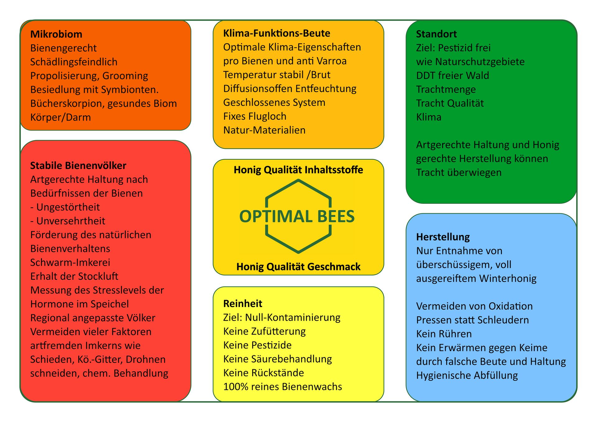 Bienen sind extrem anpassungsfähig, aber nicht unbegrenzt belastbar. Nach wissenschaftlichen Untersuchungen gibt es auch für sie optimale Lebensbedingungen. Nach diesen Werten haben wir die OPTIMAL entwickelt und gebaut.