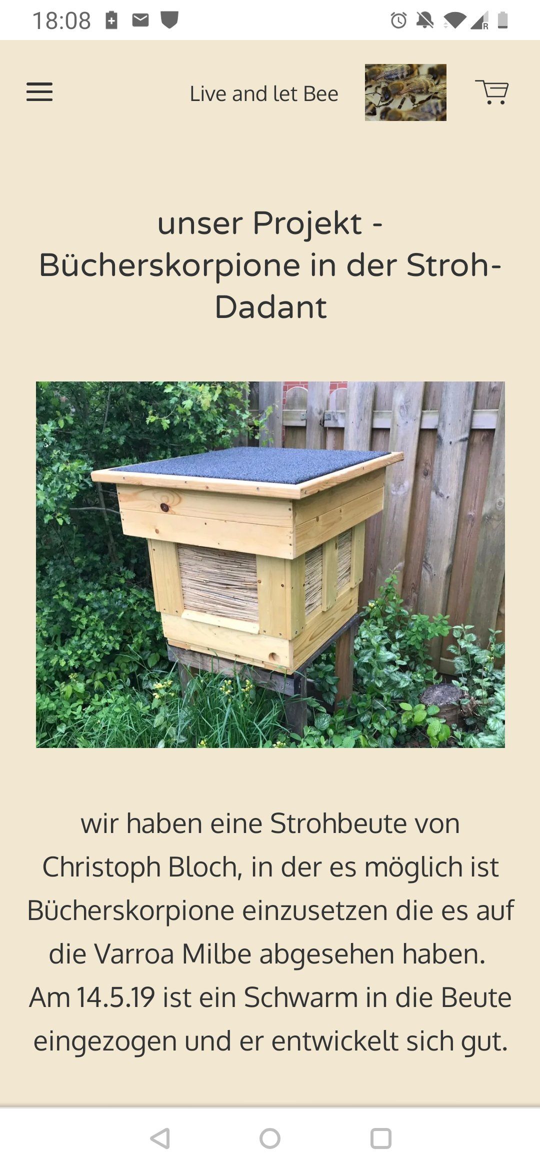 "Como apicultor principiante, me decidí por la colmena Optimal Bee porque el Sr. Bloch me dio mucha información sobre ella (a través de Internet y, sobre todo, por teléfono). La idea de que a las abejas les resulte más fácil (por supuesto) aislada) me facilitó la decisión. Es obvio que las abejas en una casa aislada (colmena) consumen menos energía, como lo hacemos los humanos en nuestras propias casas. Además, los materiales de construcción son ideales para otras criaturas, como por ejemplo. el libro escorpión para crear un hábitat donde se sientan cómodos.